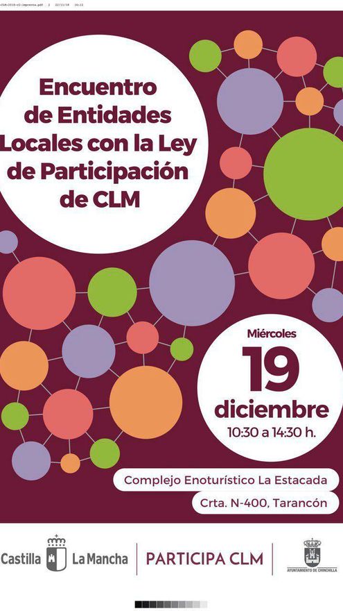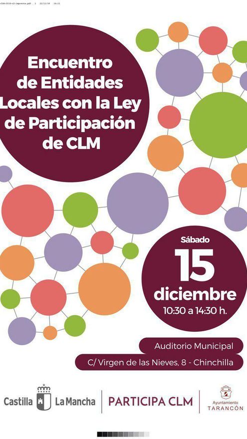 La Dirección General de Participación Ciudadana de Castilla-La Mancha ha organizado dos encuentros con los Ayuntamientos de Chinchilla y Tarancón para explicar el impacto de la futura Ley que han impulsado en la administración más cercana a los ciudadanos. El primero de ellos se celebra este sábado 15 de diciembre en el Auditorio Municipal de Chinchilla (Albacete) entre las 10.30 y las 14.30 horas. El siguiente será en Tarancón, en el Complejo Enoturístico La Estacada, en el mismo horario.