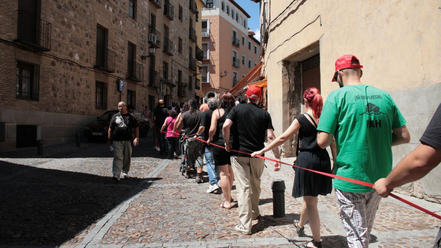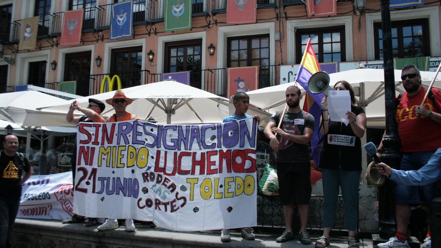 Asociaciones vecinales, plataformas contra el fracking y el Cementerio Nuclear de Villar de Cañas, asociaciones de consumidores y afectados por las preferentes, Plataformas de Afectados por la Hipoteca, Juventudes Comunistas y muchos otros colectivos, junto a ciudadanos de todas las edades, se reunieron en Toledo para cruzar el casco histórico de la ciudad en una cadena desde la Delegación de Gobierno hasta el Convento de los Gilitos, sede de las Cortes regionales. Con la supervisión de la policía nacional y local, quienes estimaron la convocatoria en poco más de 350 personas, la marcha se deslizó a través de la ciudad de manera pacífica y sin mayores incidentes, con gritos que exigían “pan, trabajo y techo”, la eliminación de la reforma electoral de Castilla-la Mancha, la deorgación de la reforma laboral y soluciones inmediatas a los recortes sociales. No se quedó fuera el llamado masivo por la III república, exigiendo la convocatoria de un referéndum para escuchar la opinión ciudadana.