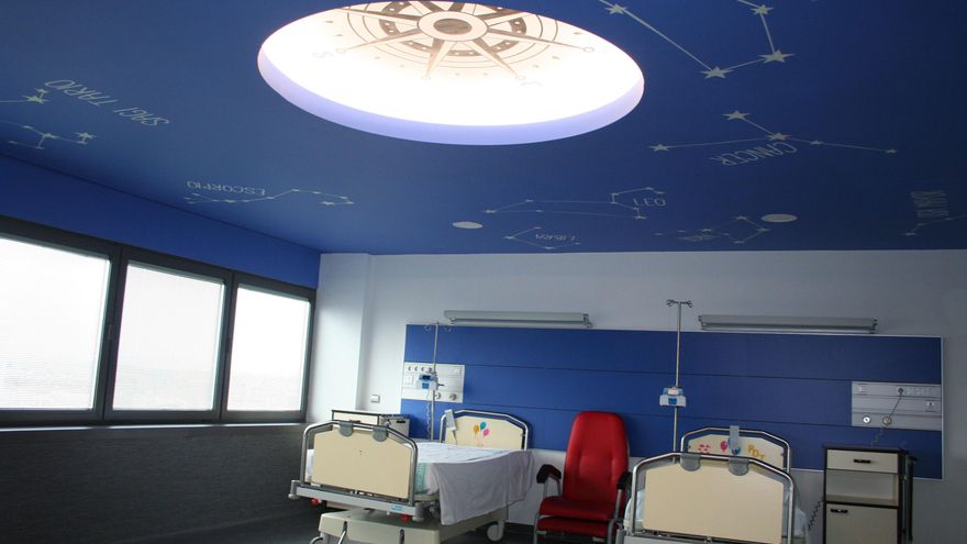 La Unidad de Oncohematilogía Pediátrica cuenta también con una nueva sala de Hospital de Día y sala de espera. Todo está cuidado para que la estancia en el hospital sea más agradable, incluso la decoración que convierte el techo en un cielo estrellado al que mirar. Para ello se ha contado con un presupuesto cercano a los 200.000 euros al ha contribuido también AFANION, colectivo que ha colaborado tanto en la financiación de equipamiento auxiliar (televisiones y frigoríficos), como en la decoración del Hospital de Día y de la sala de espera.