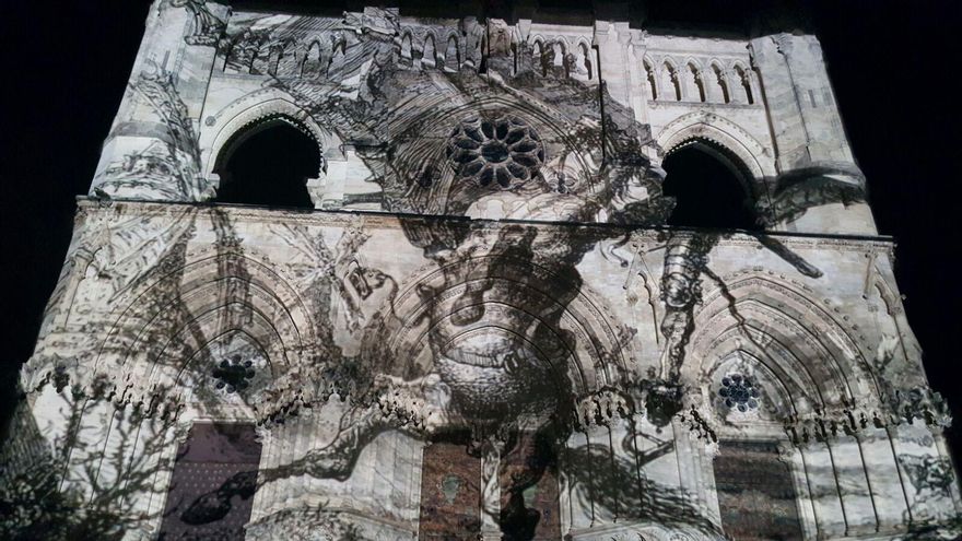 Así, se recrearon las fachadas de arte abstracto que la llenan habitualmente de luz, se homenajeó su gótico más puro y, en uno de los momentos más emocionantes de la noche, la fachada se llenó de los rostros de decenas de refugiados, en un recuerdo al compromiso cívico del artista y disidente chino Ai Wewei.