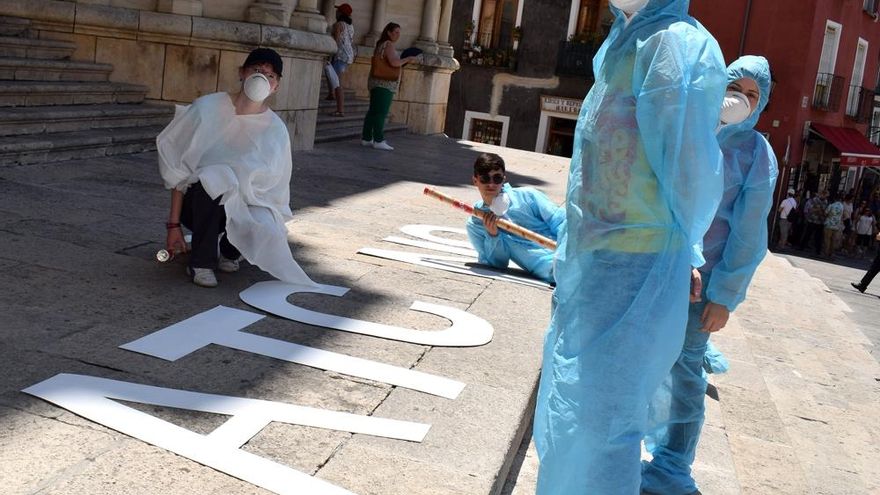 El casco antiguo de la capital conquense se ha convertido en un “plató de cine” para recrear la evacuación de la ciudad ante la amenaza de contaminación nuclear. Los participantes, equipados con mascarillas, paraguas y maletas, han marchado hacia la Plaza Mayor, donde “han caído fulminados” al suelo mientras unos operarios con mono anticontaminación exhibían unas grandes letras con el texto: 'ATC no'.