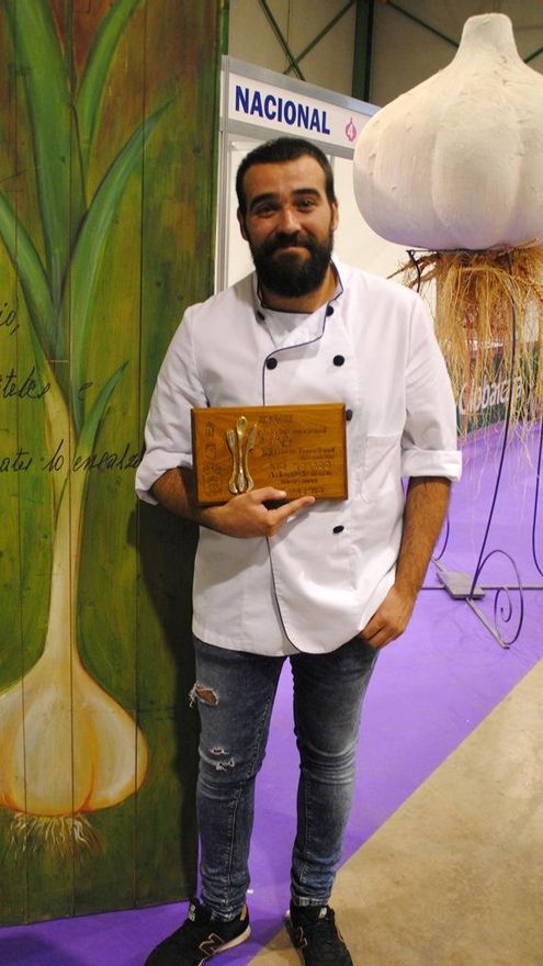 El segundo clasificado es Javier García, de Casas de Juan Núñez -Albacete-, quien ha presentado el plato Del huerto a la boca (falso ajo relleno de un cremoso de ajoarriero ahumado y verduritas de la huerta), y ha obtenido un premio de 500 euros.