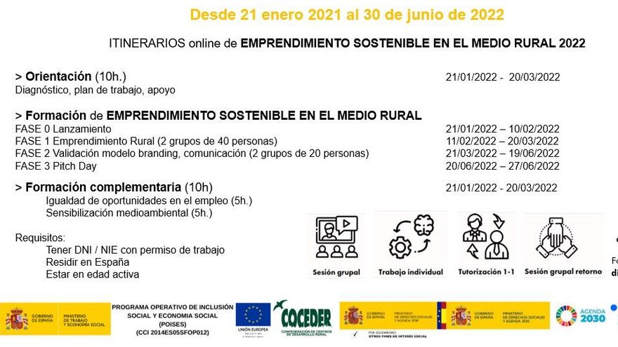 Contiene una formación sobre emprendimiento sostenible en el medio rural de manera online que se desarrollará del 21 de enero al 27 de junio, en colaboración con ESNEPI. (VER Cronograma).