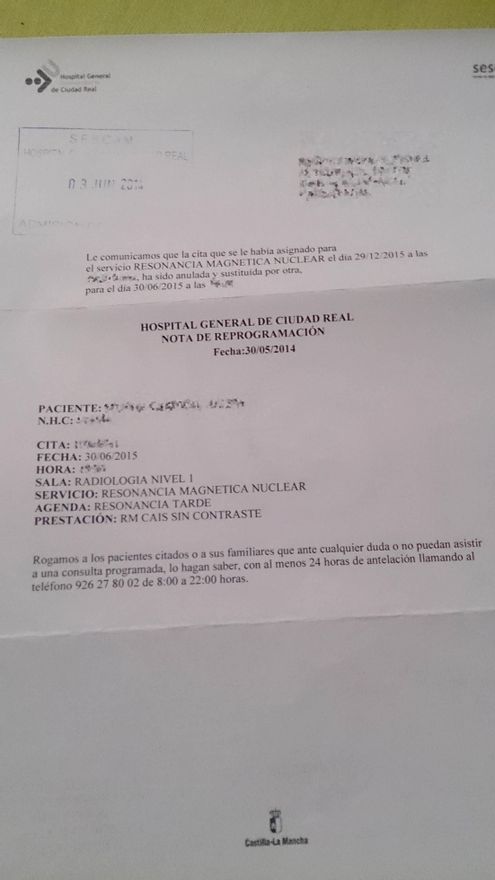 La cita para esta prueba diagnóstica, una resonancia magnética craneal, se la concedieron para diciembre de 2015, una espera de casi dos años, ya que la consulta con el especialista fue en febrero. La sorpresa la ha tenidos, cuando una vez se informó desde el Sescam que ya no existe espera para las resonancias magnéticas, el 3 de junio recibía una carta en la que se le informaba que se le adelantaba su cita de diciembre de 2015 a junio, lo que implica que todavía deberá esperar un año para saber si el tumor sigue ahí y las causas de los pitidos y sordera que padece.