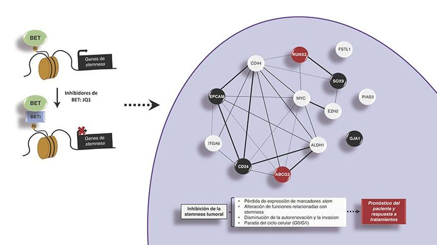 Utilizando modelos celulares y modelos preclínicos en ratones, los investigadores observaron que el compuesto JQ1, un potente inhibidor de las proteínas BET, provocaba una disminución de los niveles de expresión génica de los trece genes identificados. Además, este inhibidor alteraba propiedades stemness de manera notable en los modelos celulares in vitro empleados. “Esto podría conducir a tumores menos agresivos y más sensibles a un tratamiento estándar con quimioterapia, lo que se reflejaría en un mejor pronóstico para las pacientes”.