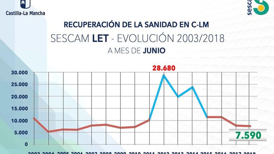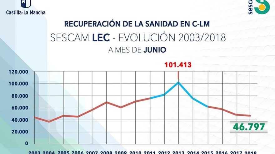 El Servicio de Salud de Castilla-La Mancha ha hecho públicas las cifras de las listas de espera a fecha de junio de 2018 para ofrecer datos que apuntan a que hoy existen 50.730 pacientes menos que el mismo mes del tercer año de la legislatura de Dolores de Cospedal.