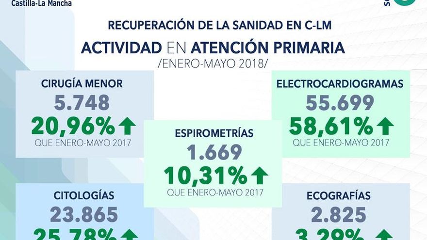 Así, ha indicado que en los cinco primeros meses de este año, los profesionales de Atención Primaria han realizado 5.748 intervenciones de cirugía menor, casi un 21 por ciento más que en el mismo periodo del año anterior; 23.865 citologías, un 26 por ciento más; 55.699 electrocardiogramas, un 59 por ciento más; 1.669 espirometrías, un 10,3 por ciento más; y 2.825 ecografías, un 3,29 por ciento más.