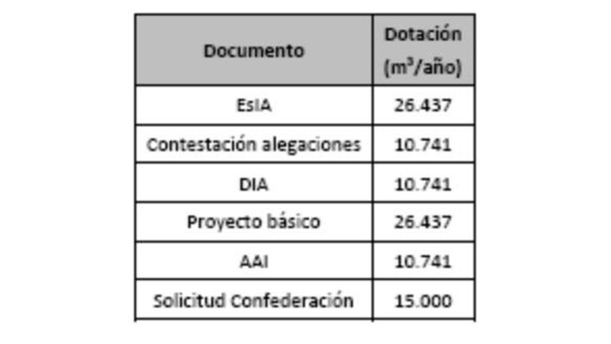 Encuentran contradicciones en la fuente de abastecimiento propuesta y un “baile de cifras” en cuanto al consumo final de agua en los distintos documentos consultados o aportados a las administraciones competentes. Se solicitan 15.000 m3 a la Confederación Hidrográfica del Guadiana que, en su opinión, “no serán suficientes”.