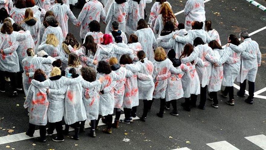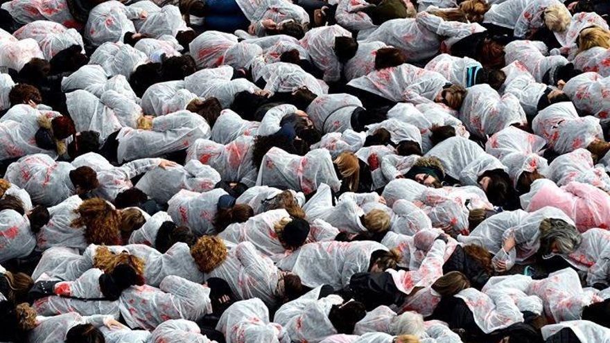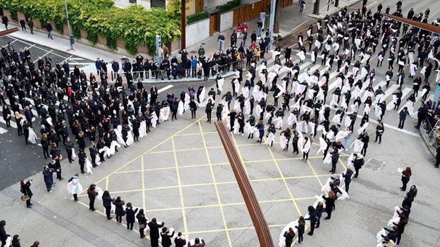 Cientos de mujeres se han vestido de negro para representar a las mujeres asesinadas por sus parejas o exparejas. Durante la performance se han cubierto con una bata blanca “ensangrentada” y han ido cayendo una a una sobre el asfalto, “en memoria de cada una de las mujeres asesinadas, 1064 desde que hay registros oficiales por violencia de género, desde 2003”.