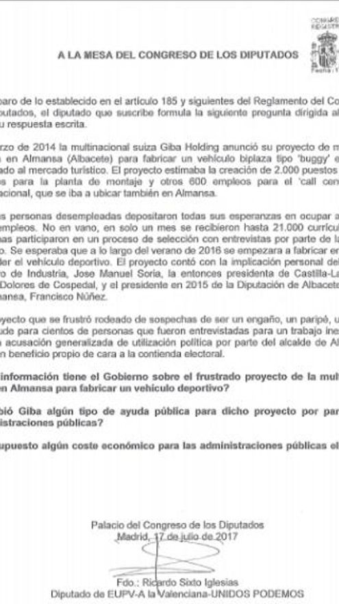 Así, este mismo lunes Sixto trasladó al Gobierno una pregunta que consta de tres partes y a la que ha tenido acceso esta redacción. El diputado se interesa por la información que pueda tener el Ejecutivo nacional el “frustado proyecto de la multinacional” para instalarse en Almansa y allí fabricar un coche deportivo. La pregunta se sustenta en que fue un ministro de Rajoy en la pasada legislatura, José Manuel Soria, quien participó en el I Encuentro de Empresas de Automoción que se hizo “ex profeso” para que la multinacional se presentara en sociedad. El diputado valenciano también pregunta si esta empresa recibió algún tipo de para dicho proyecto y, finalmente, y si este “pufo” ha supuesto dinero a las administraciones.