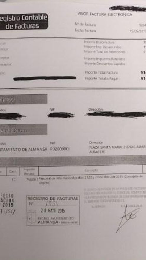 Con esta factura en la mano y según Cristian Ibáñez, portavoz de IU-Los Verdes en el consistorio almanseño queda demostrado que la selección de personal “la pagó el Ayuntamiento de Almansa, el alcalde pagó de las arcas municipales a personal que trabajó para Giba en la supuesta selección de los trabajadores”
