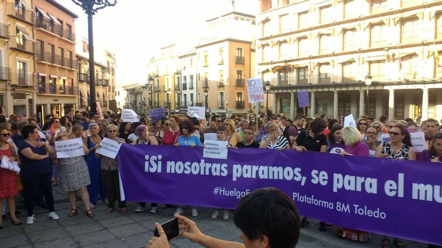 Castilla-La Mancha respondió a la convocatoria nacional en protesta a la puesta en libertad de los miembros de 'la manada' con concentraciones en diferentes localidades de las cinco provincias. Unas 300 personas se sumaron en Toledo a la concentración convocada por la plataforma 8M, en la que se gritó en contra de la “justicia de mierda, la estás culpando a ella”. “Sola, borracha, quiero volver a casa” gritaron los asistentes en la céntrica plaza de Zocodover, que pedían “hacer ruido” en contra de la decisión de dejar en libertad provisional a los miembros de 'la manada'.