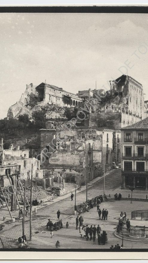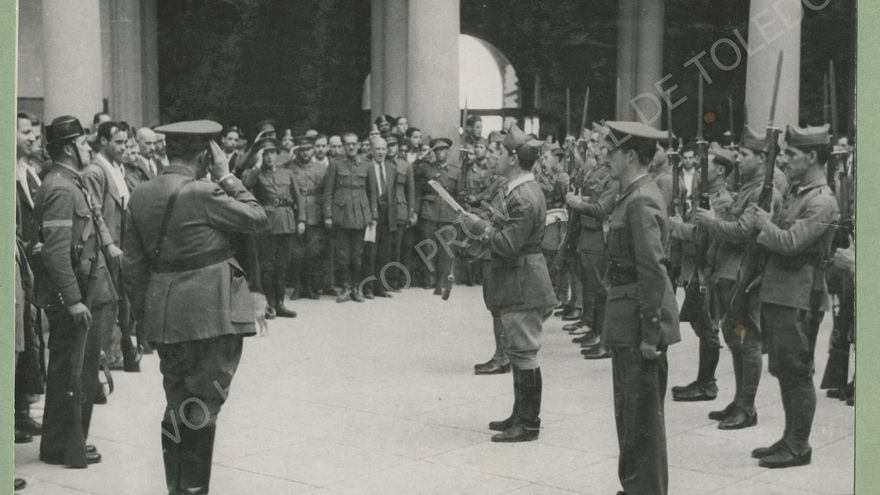 El Fondo Rodríguez al que pertenece la instantánea es uno de los más interesantes para conocer lo que ocurrió. Desde la declaración del estado de guerra en el patio Alcázar el 18 de julio de 1936, hasta las ruinas del edificio entre las que llegaron a celebrarse ceremonias castrenses.