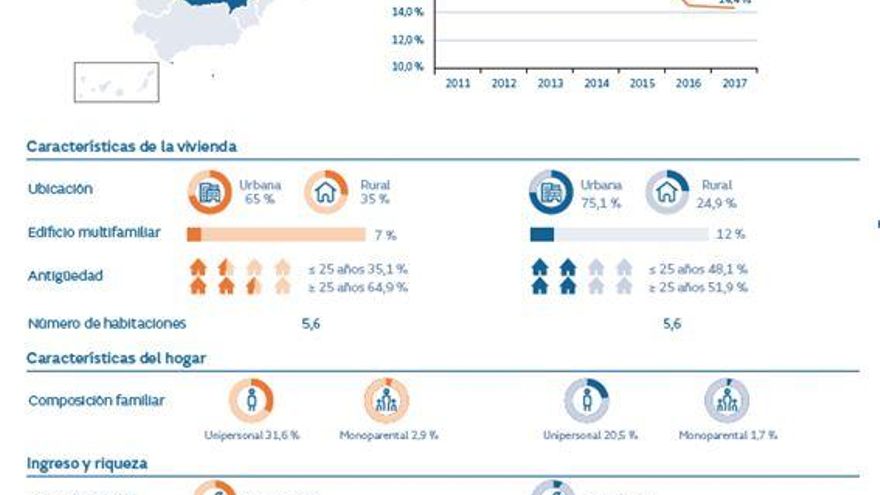 A partir de la investigación de la Cátedra de Sostenibilidad Energética, se puede configurar un perfil de los hogares españoles en situación de pobreza energética: están ubicados en áreas rurales o con menor densidad de población; viven en régimen de alquiler; en edificios de 25 años o más, y en zonas con condiciones meteorológicas extremas de calor o frío; y son hogares unipersonales o monoparentales, sustentados en buena parte por mujeres.