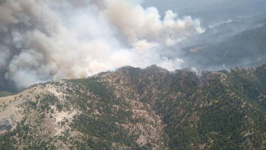 Día y medio después de que se iniciase el incendio, declarado ya de Nivel 2, los efectivos de la Unidad Militar de Emergencias (UME) trabajan con los efectivos de Geacam, SEPEI y agentes medioambientales en las labores de extinción. Sobre el terreno son 200 los efectivos que trabajan por tierra y aire para conseguir acotar el fuego que, tras el último cambio del viento, ha avanzado a más velocidad de lo que lo había hecho en las últimas horas. Lo peor es el difícil acceso por tierra por lo que se prioriza el la lucha desde el aire. De hecho, el Ministerio de Agricultura ha enviado tres aviones anfibios tipo Canadair, de 5.500 litros de capacidad de descarga, procedentes de la base albaceteña de Los Llanos y Torrejón de Ardoz, en Madrid, a los que se unen a los dos helicópteros bombarderos 'Kamov', de 4.500 litros de capacidad, que han salido de sus bases en Huelma en Jaén y Caravaca en Murcia . También se encuentran en esta zona otros dos aviones anfibios, de 3.100 litros, de la base de valenciana de Manises, y una Brigada de Refuerzo en Incendios Forestales (BRIF), con sus dos helicópteros de transporte y descarga de agua, de la base de Prado de los Esquiladores en Cuenca.