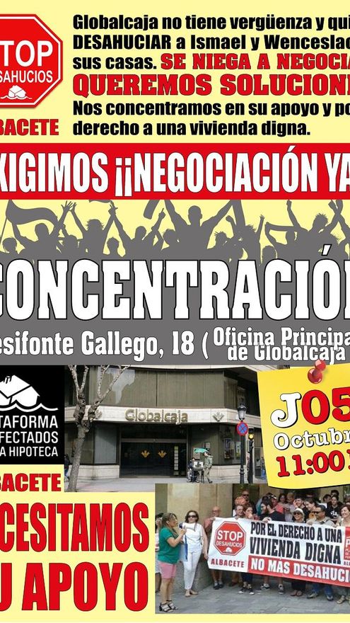Ante esta situación y tras los fallidos intentos de conseguir un acuerdo con Globalcaja el colectivo de Afectados por la Hipoteca de Albacete, Stop Desahucios, ha convocado una concentración a las puertas de la oficina principal de la entidad bancaria en Albacete capital. “Queremos que negocien, que las familias puedan seguir con su vivienda habitual”, dice Alba Teresa Higuera, miembro de la PAH albaceteña, que asegura que el objetivo es que ese mismo día los reciban en la oficina y salir de ahí con una solución. Tienen antecedentes, dice Higuera, que recuerda que con otros bancos han conseguido que a personas de estas edades, se ha conseguido llegar a un acuerdo sin que ello implique que los hijos o más familiares tengan que avalar con sus propiedades tal y como pretendería Globalcaja, según cuenta Sonia.