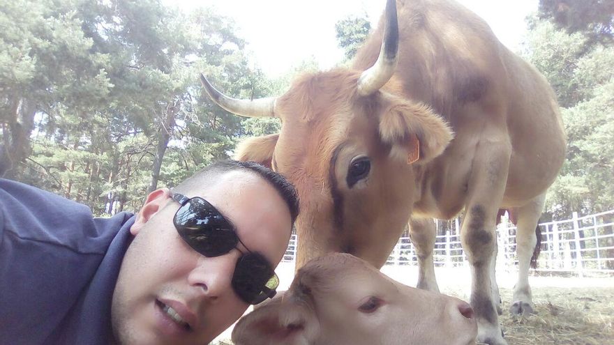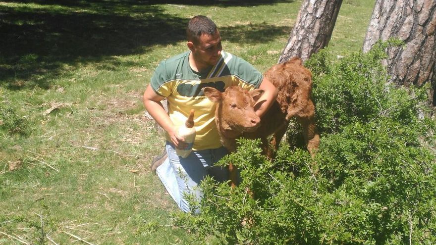Roberto Capilla, de 29 años hunde sus raíces en la pequeña localidad serrana de Somolinos. Durante la crisis se replanteó su futuro y cambió su empleo de solador de la construcción en Alcalá de Henares por el de ganadero en las dehesas de la Sierra Norte. “No te haces rico con la ganadería, es un trabajo duro y constante, pero se puede vivir de ello, explica a eldiarioclm.es. Todo empezó en el verano de 2015, cuando Roberto se hizo cargo de forma temporal de la cabaña de vacas de un familiar que se encontraba de baja laboral. ”Siempre me ha llamado la atención el campo, empecé a aprender este mundo gracias a mi suegro y, aunque, al principio, tuve que desembolsar mucho dinero para comprar los animales y la maquinaria, me gusta la ganadería“.