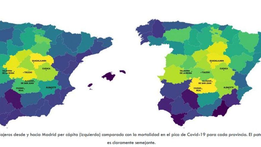 En el informe se establece así una “clara evidencia” de la relación entre la movilidad y la mortalidad provocada por la COVID-19 en base a mediciones: sus autores han comparado el número de visitantes entre el foco principal en España (Madrid) con el resto de las provincias, tanto los residentes de Madrid visitando otros lugares, sobre todo provincias interiores de Castilla-La Mancha y Castilla y León, como los residentes de otros lugares visitando Madrid, ya que ambas direcciones son importantes en la transmisión.