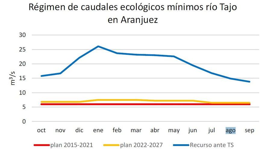 En Aranjuez y en tres de las masas de agua inmediatamente aguas arriba de Aranjuez, que recordemos forman parte de la Red Natura 2000, ya que son consideradas Zonas de Especial Conservación (ZEC) y Zonas de Especial Protección para las Aves (ZEPA), los caudales ecológicos se han establecido de forma progresiva hasta 2027, estando fijados hasta 2025 unos caudales prácticamente iguales a los que están vigentes en la actualidad de 6 m3/s en Aranjuez. En la siguiente figura puede apreciarse cómo la supuesta mejora en los caudales ecológicos mínimos no es en verdad tal, no difiere prácticamente nada de lo que estaba fijado ya (véanse las líneas roja y amarilla). Este mal denominado por la Confederación como caudal ecológico mínimo no puede ser calificado como la cantidad mínima de agua que debe circular por el río para que se mantengan y mejoren los hábitats y especies de la zona. Por el contrario, la línea azul, que es la que se propuso en el recurso ante el Tribunal Supremo, permitiría ver un río Tajo en movimiento en Aranjuez, permitiría recuperar parte de su condición de río y permitiría mejorar el estado de conservación de la fauna piscícola.