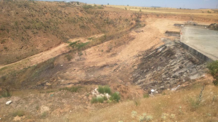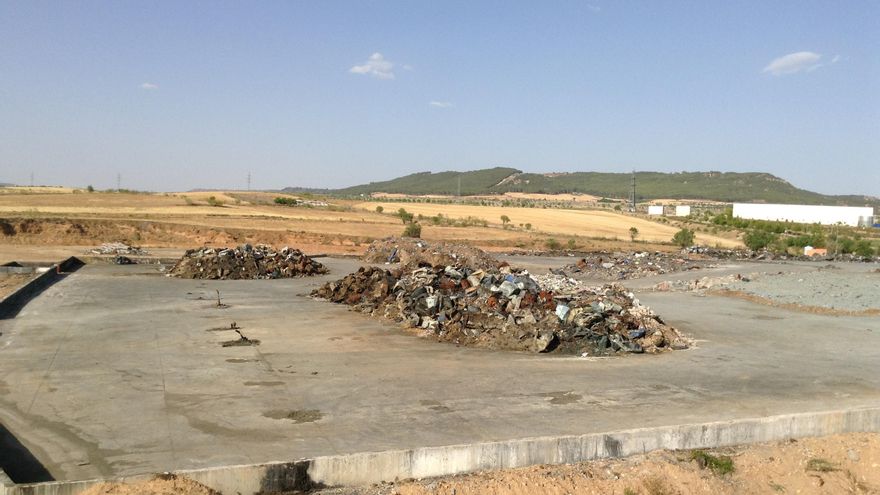 Un cementerio de residuos sólidos y líquidos calcinados. Eso es lo que cualquiera puede encontrarse si se acerca al emplazamiento donde hasta hace un año se ubicaba la planta de reciclaje devastada en el incendio de Chiloeches, una localidad cercana a Guadalajara capital. El paisaje resulta entre lunático y tóxico. Desechos aglomerados, amasijos de coches, neumáticos tirados por el suelo, elementos textiles, bidones sueltos. Todo ello se concentra en la zona del fuego, además de los signos de contaminación y restos de chapapote aún visibles en los arroyos, las laderas y los sumideros que se sitúan a menos de un kilómetro del cauce del río Henares.