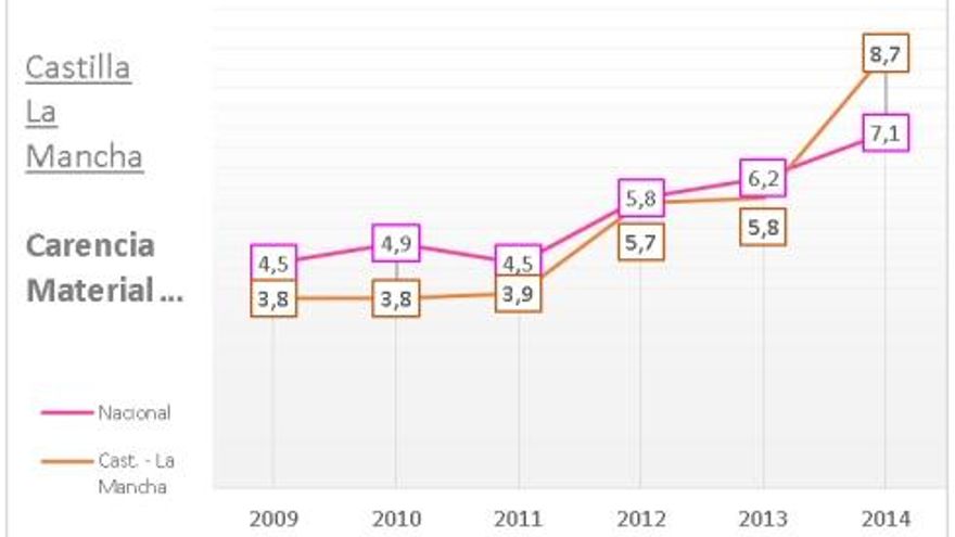 Otro dato muy significativo se encuentra en la pobreza severa, que sufren hasta un 8,7% de los castellano-manchegos y que es un 27% superior a la media española. En total hay unos 178.000 castellano-manchegos que sobrevivir con ingresos inferiores a 332 euros mensuales por unidad de consumo.