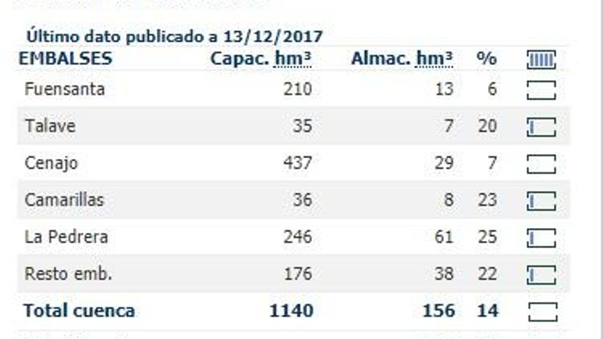 La sequía que especialmente este último año vienen padeciendo buena parte de las cuencas hidrográficas del país no es ajena a la provincia de Albacete en cuyo territorio se comprende la mayor parte de la cabecera de la cuenca del río Segura. Aquí la escasez de agua deja a los pantanos de la demarcación a niveles mínimos que apenas se recordaban: el último dato de medición, con fecha 13 de diciembre, establece que los pantanos están, en su conjunto, al 14% de su capacidad.