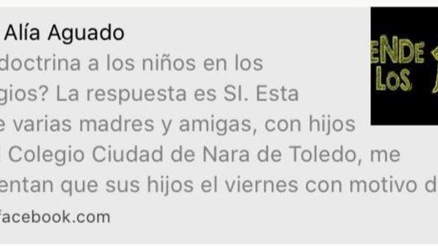 “¿Se adoctrina a los niños en los colegios? La respuesta es SÍ. Esta tarde varias madres y amigas, con hijos en el Colegio Ciudad de Nara de Toledo, me comentan que sus hijos el viernes con motivo del Carnaval, cantarán la canción que os dejo. Juzgar por vosotros mismos. Si esto no es adoctrinar, que venga Dios y lo vea”, afirmaba en su publicación.