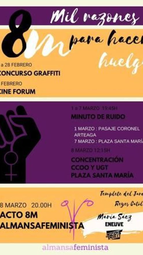 En el resto de la provincia los colectivos feministas también han preparado un programa de actos con motivo del Día de la Mujer. Es el caso de Almansa donde el colectivo Almansa Feminista ha organizado desde el mes de febrero varias actividades como el ‘Concurso de Graffity’ y un ‘Cineforum’. Por cierto que este colectivo quiere hacer ruido los dias previos al 8M y por ello ha convocado ‘El Minuto de Ruido’ del 1 al 7 de marzo en varios puntos de la localidad.