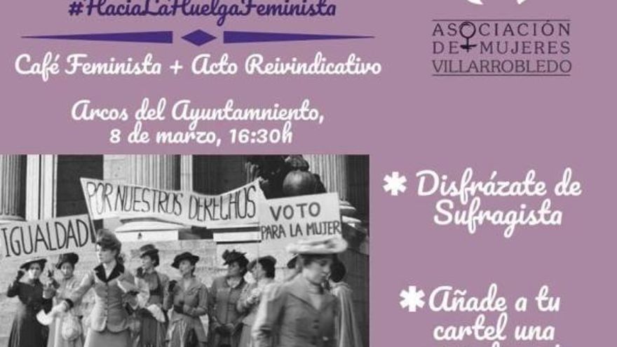 Villarrobledo estará inmerso en plena celebración de su Carnaval y por ello quieren que el acto del 8M tenga esos tintes carnavalescos. Por ello la Asociación de Mujeres de Villarrobledo ha convocado a un ‘Café Feminista’ el 8 de Marzo, a las 16:30 horas a las puertas del Ayuntamiento de Villarrobledo e invita a las participantes a que vayan disfrazadas de sufragistas.