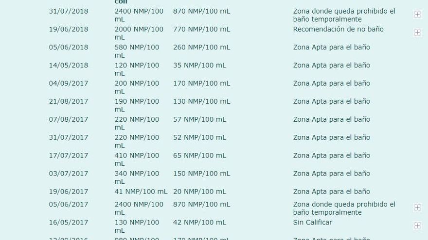 En este sentido, según los registros del Náyade, cabe destacar que también el verano de 2017 también se registraron altos niveles de enterococos intestinales y de E.Coli que llevaron a prohibir el baño durante los primeros días del mes de junio, tal y como se puede observar en las muestras recogidas que se enumeran en la imagen inferior.
