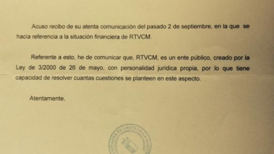 Al menos la Consejería ha respondido: la misma carta enviada a la presidenta del Consejo de Administración de RTVCM ni siquiera ha sido respondida, por lo que se hace complicado preguntar sobre el estado financiero de la empresa cuando una parte insta a preguntar a la otra, y la otra ni lo hace.