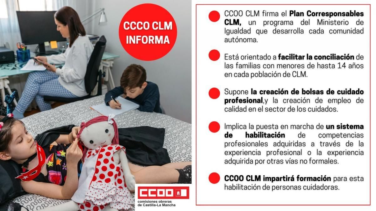 Un total de 200 millones de euros ha dedicado el Gobierno de España al Plan Corresponsables, impulsado desde el Ministerio de Igualdad. A Castilla-La Mancha, que lo gestionará a través del Instituto de la Mujer, corresponden 16 millones de euros, una cifra que se corresponde con el número de menores que hay en la región. El sindicato Comisiones Obreras es una de las entidades colaboradoras de este proyecto “tan importante” que pretende funcionar como una “semilla” de cara a visibilizar la importancia de los cuidados en la sociedad actual.