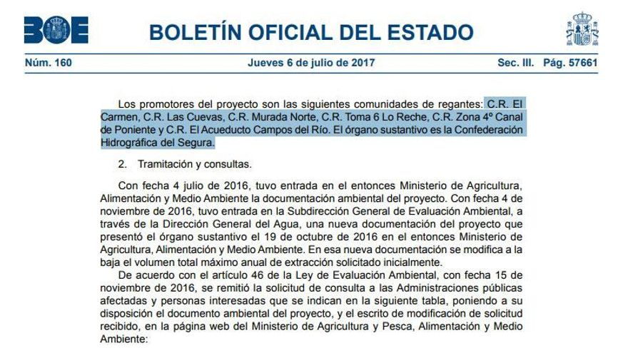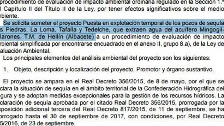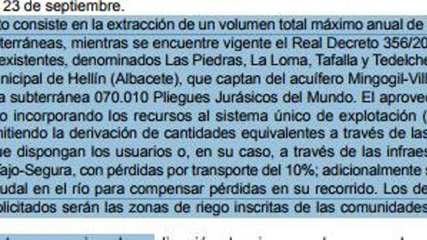 Se refiere en concreto a la Resolución de 14 de junio de 2017, de la Secretaría de Estado de Medio Ambiente, publicada en el BOE el pasado 6 de Julio, que señala como beneficiarias a las comunidades de regantes C.R. El Carmen, C.R. Las Cuevas, C.R. Murada Norte, C.R. Toma 6 Lo Reche, C.R. Zona 4º Canal de Poniente y C.R. El Acueducto Campos del Río, algunas de ellas integradas en el sindicato murciano de regantes. En esa misma resolución se puede leer que lo que se solicita es la extracción de un volumen total máximo anual de 3.439.713 m³ de aguas subterráneas de cuatro pozos existentes, denominados Las Piedras, La Loma, Tafalla y Tedelche, situados en el término municipal de Hellín, que captan del acuífero Mingogil-Villarones. Así, el texto dice que el agua de estos pozos se incorporaría al vertido del río Mundo para llegar a su destino: las zonas de riego inscritas de las comunidades de regantes solicitantes.