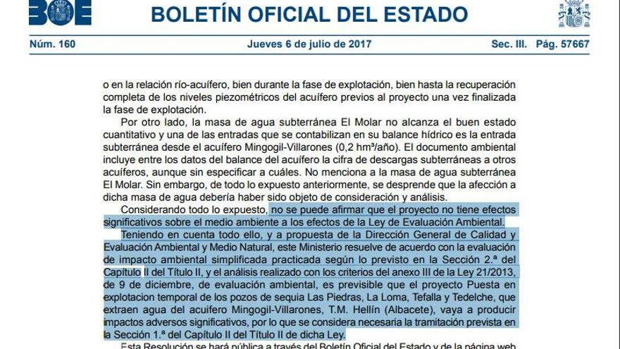 La resolución del BOE concluye asegurando que con la evaluación de impacto ambiental simplificada solicitada por las comunidades de regantes interesadas en los pozos de sequía no se puede afirmar que el proyecto no tenga efectos significativos sobre el medio ambiente y que es posible que estos efectos adversos sí se produzcan, por lo que se necesita una declaración de impacto ambiental ordinaria.