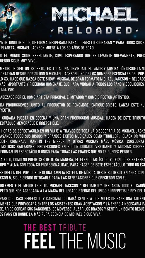 Casi ocho años han pasado desde la muerte de Michael Jackson, el 25 de junio de 2009, “de forma inesperada” para quienes lo rodeaban y para todos sus seguidores. El recuerdo de la leyenda de la música no ha muerto, sino que sigue todavía muy vivo, especialmente entre sus más acérrimos seguidores, como Jonathan Reghif. Es desde su mano que nace el espectáculo 'Michael Jackson Reloaded' que llegará próximamente a Toledo y Albacete.
