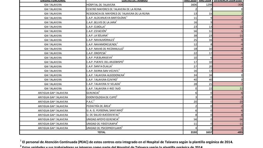 Solo un centro de la Gerencia del Área Integrada de Talavera, de los 29 con los que cuenta, ha ganado trabajadores respecto al 2010, concretamente la residencia de mayores de Talavera, así como el centro de salud Talavera V-Río Tajo que en 2010 aún no existía y cuenta con 22 personas. Entre los otros 27 centros se reparten 185 pérdidas más de empleos, en ocasiones porque algunos de ellos se han eliminado y han dejado de prestar servicio.