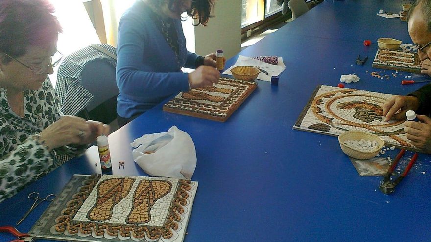 Rosa es experta en la técnica del mosaico romano “como la hacía en los tiempos de la antigua Roma”, una forma de trabajar que requiere de una técnica muy depurada y de mucho tiempo de esmero. “Lo hacemos al revés”, señala la artesana, que continúa diciendo: “Y le ponemos la masa por encima”. Es decir, coloca primero las piezas que compondrán el mosaico, pero del revés, de tal manera que se trabaja con la zona que será visible totalmente boca abajo. Una vez montadas las piezas se añade la masa y es entonces cuado se le dá la vuelta. Con esta técnica, dice Rosa, “se consigue que el mosaico salga totalmente liso y perfecto”.