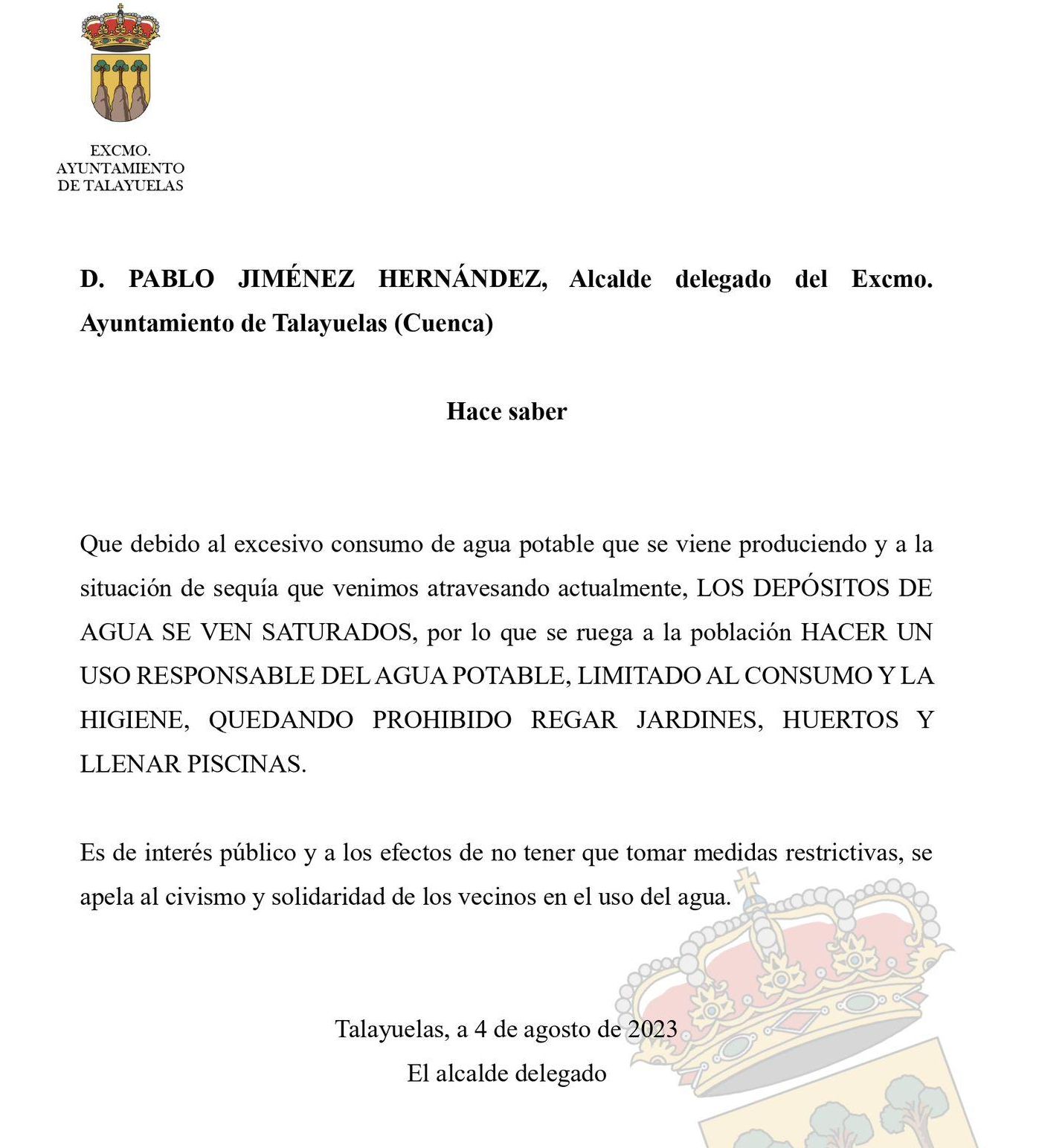 Los depósitos de agua de la pequeña localidad de Talayuelas en Cuenca están “saturados” debido al “excesivo consumo de agua potable y la situación de sequía”. Es por eso que se ha pedido a través de un bando municipal hacer un uso responsable del agua potable, limitado al consumo y la higiene y prohibiendo regar jardines, huertos y llenar piscinas. “Es de interés público y a los efectos de no tener que tomar medidas restrictivas, se apela al civismo y solidaridad de los vecinos en el uso del agua”, advierte el alcalde delegado, Pablo Jiménez. Sin embrago, la situación no es temporal, sino que viene derivada de varios problemas que se sufren en la localidad.