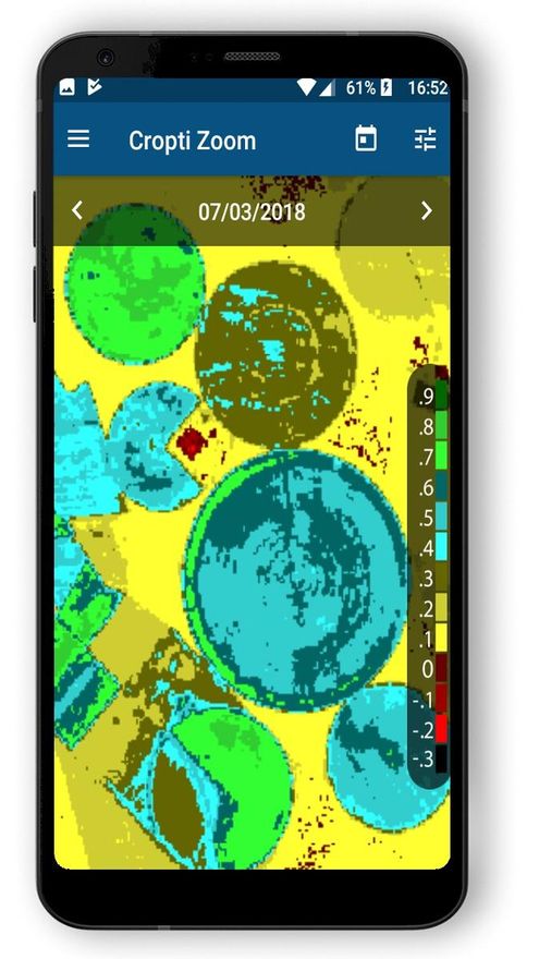 Esta aplicación de momento incluye la identificación vía satélite de una ‘zona de interés’ que previamente el agricultor define. Es sobre esta ‘zona de interés’ sobre la cual se aplican los filtros de índice de vegetación, que a través de un código de colores identifican su estado vegetativo. Estos índices son de tres tipos: RGB, que reproduce el color de la superficie terrestre tal y como lo percibe el ojo humano; NDVI, el índice de vegetación más utilizado, que permite saber el grado de desarrollo que tiene el cultivo o la dehesa y el índice EVI, el más idóneo para localizar las partes con mayor potencial de crecimiento dentro de una parcela.