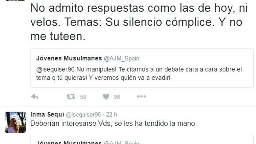 La vicesecretaria de Juventud de VOX y presidenta de la formación en Cuenca, Inma Sequí, exige a la Asociación de Jóvenes Musulmanes de España que se manifieste ante los atentados llevados a cabo por el auto-proclamado Estado Islámico en varios países europeos. Lo hace a través de su perfil personal en Twitter en el que intercambia una serie de tuits con la asociación.
