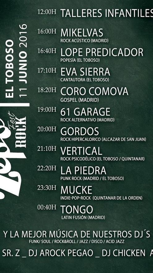 El festival comenzará a las 12:00 horas el 11 de junio y contará con las actuaciones de grupos como 'Tongo', 'Vertical' ganadores del concurso 'Rolling Rock' de Alcázar de San Juan en 2015, 'Gordos', que lo ganaron en 2014, 'Mucke','La Piedra', '61 Garage', 'Eva Sierra', o 'Juanete del Toboso', entre otros. “Hemos tratado hacer un abanico de oferta musical muy diferente para abrir la música a todo tipo de gente y de edades”, concluye Muñoz, que señala que incluso actuará un coro de gospel.