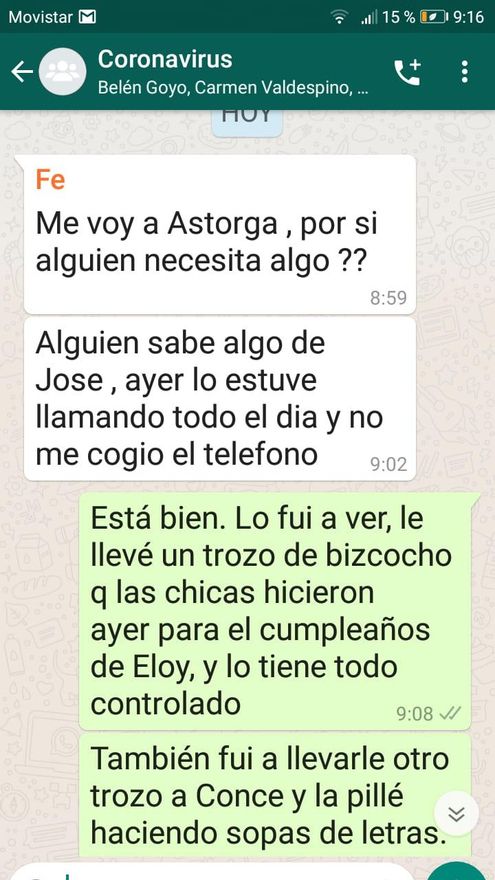 Es lo que hacen Carmen, Dolores, Esther, Maricarmen, Fe, Patricia, Zaira, Belén y Toñi. Nueve mujeres que viven en Valdespino de Somoza, una localidad maragata de apenas cincuenta habitantes a 10 kilómetros de Astorga (León). A través de Whatsapp se organizan para estar pendientes de los más mayores del pueblo y, sobre todo, aquellos que viven solos, para “dar solución ante los posibles problemas”.