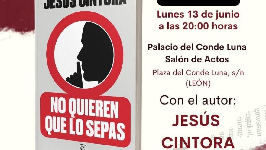 El Palacio del Conde Luna de León será escenario este lunes 13 de mayo de la presentación del libro 'No quieren que lo sepas', del periodista Jesús Cintora. Un acto en el que se abordará la temática del libro, la situación política y periodística española, y que cuenta con la colaboración del Ayuntamiento de León, ILEÓN y elDiario.es Castilla y León.