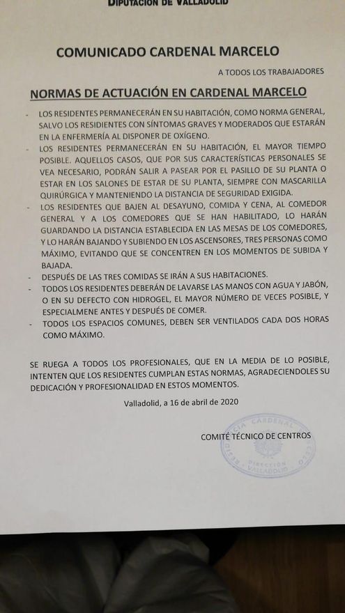 No sólo hay documentación que lo prueba. La propia residencia demuestra que es ahora, con el 98% de los ancianos contagiados, cuando asume un funcionamiento acorde con el que impuso la Junta de Castilla y León mes y medio antes. Este jueves un comunicado para los trabajadores con 'normas de actuación' y fecha de 16 de abril imponía las normas que obvió en su momento .