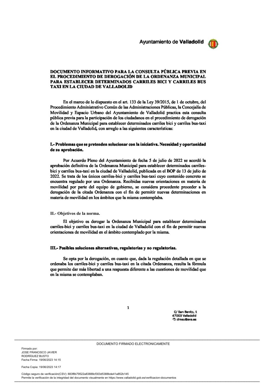 También se recuperará la circulación general y se borrará la señalización (horizontal y vertical) en siete de los carriles bus taxi que estableció el gobierno PSOE-Valladolid Toma La Palabra en julio de 2022. En concreto, se trata de la avenida de Gloria Fuertes (entre la avenida de Salamanca y el puente de Poniente), el puente de Poniente, la plaza de la Universidad, la calle López Gómez, el puente de Isabel La Católica, la avenida de Miguel Ángel Blanco (entre puente de Isabel la Católica y calle Joaquín Velasco Martín).