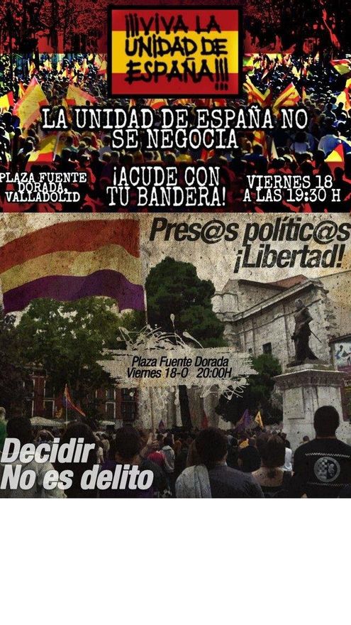 Además, en la tarde de este viernes se tiene constancia de al menos otras dos convocatorias. Se trata de una primera que comunicó hace tiempo la Red Incola en defensa de los derechos de los inmigrantes en Fuente Dorada a las 20.00 horas y otra a favor de la unidad de España que se solicitaba en el mismo punto a las 19.30 horas, que ha sido promovida en Twitter por la Falange.