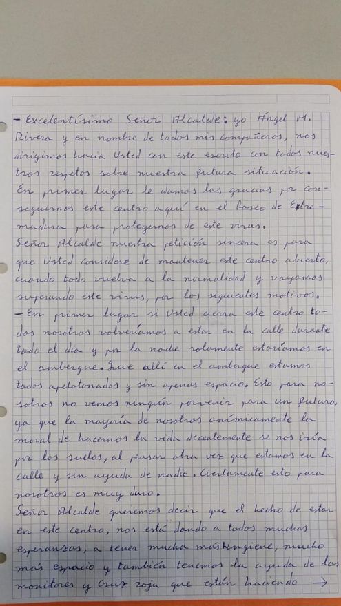 Ángel, apoyado por todos los usuarios 'sin techo', ha agradecido al Ayuntamiento que instalase este centro para evitar que se contagiaran de COVID-19 y reconoce el trabajo de los voluntarios y trabajadores del centro. “Están haciendo un trabajo fenomenal, todo el día cuidándonos, dándonos consejos, subiéndonos la moral cuando estamos decaídos, enseñando a la gente a leer y escribir, etc.”, explica en la carta, a la que ha tenido acceso eldiario.es. “Estar en este centro nos está dando a todos muchas esperanzas, a tener mucha más higiene, mucho más espacio y también tenemos la ayuda de los monitores y Cruz Roja”.