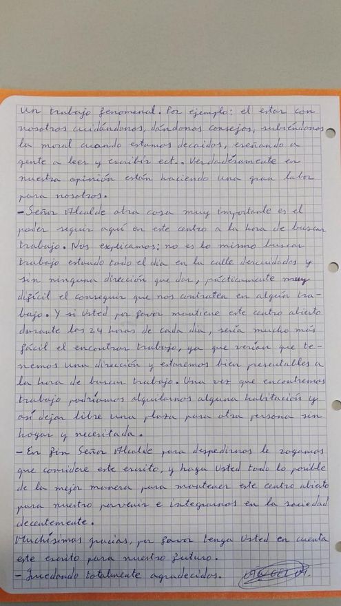 Los 'sin techo' de Valladolid han escrito una carta al alcalde, Óscar Puente, para que mantenga el centro de acogida abierto después del confinamiento durante las 24 horas del día. “Si usted por favor mantiene este centro abierto durante las 24 horas, sería mucho más fácil encontrar trabajo, ya que sería que tenemos una dirección y estaremos bien presentables”, explica en la misiva Ángel, uno de los vallisoletanos sin hogar. De esta manera, propone, una vez que vayan encontrando un trabajo, podrán alquilar una habitación “y así dejar libre una plaza para otra persona sin hogar y necesitada”.