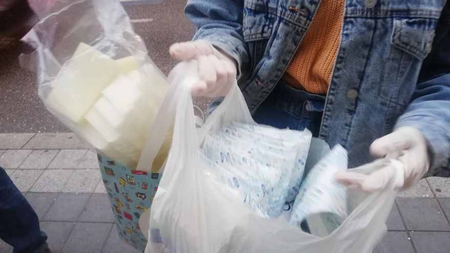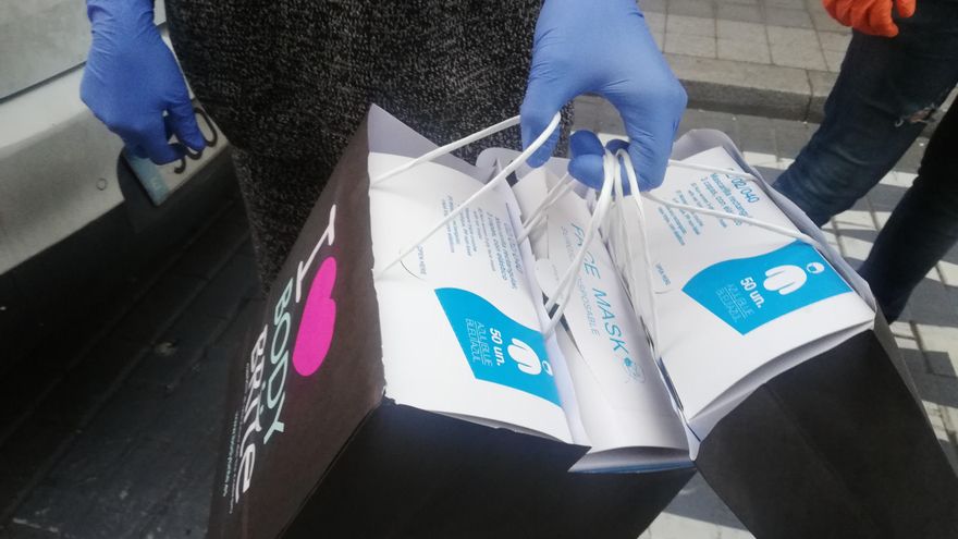 Isabel y su pareja traen una bolsa llena de cajas de mascarillas y guantes. Vienen a echar una mano. En la clínica de estética en la que trabajan no van a necesitar estos días el material, así que vienen cargados. También llevan mandiles de plástico como los que hacen falta en los hospitales de la Comunidad.