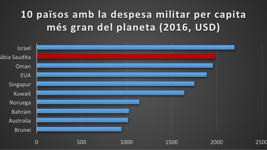 En relación al ranking que muestra el esfuerzo que cada ciudadano debe hacer para afrontar el gasto militar nacional, Riad se encuentra a nada menos que en la segunda posición mundial. Con 1.978 dólares por persona, la magnitud del gasto militar per cápita saudí sólo es superada por la de Israel, quedando por delante de estados como Omán, Emiratos Árabes o Singapur.